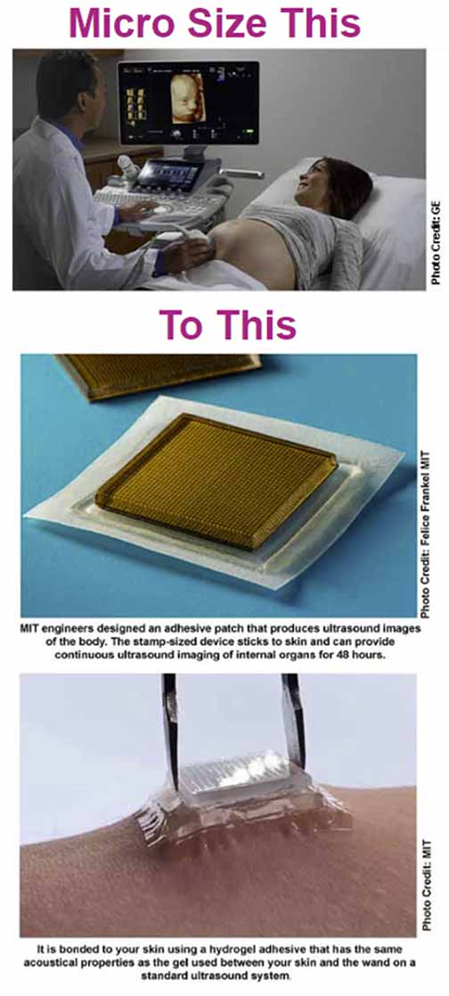 Do you like to use your smartphone to take selfies? Depending on your age you might be surprised to learn that the first photo of you was probably taken way before you were born; using current Ultrasound medical equipment. Your mom probably still has the photo and I am sure she can describe how excited she was to meet you for the first time. We are going to look at a major breakthrough which shrinks the equipment and process performed by today’s ultrasound equipment down in size so the hardware that creates the ultrasound is a stick-on patch the size of a US postage stamp. See photo 1 and 2. The Massachusetts Institute of Technology (MIT) and Mayo Clinic engineering breakthrough will change the size and place where an ultrasound might take place after the device receives proper approval for medical use. To understand the advancement, you first need to understand how an ultrasound is done today. A doctor or medical technician places a wand on your skin closest to the organ that is under study. This wand is an ultrasound transducer that produces sound waves that create images as they bounce off your internal organs and return to the wand. A gel is used to create an acoustical bond between your skin and the wand which focuses the sound waves straight into your body. This wand is always placed at the closest skin location to where the organ that needs to be viewed is located. The technician or medical doctor, doing the procedure, can see in real time on a monitor, what is physically taking place and also record the images. The MIT breakthrough shrinks the part of the equipment that creates the ultrasound images into a stamp size unit that can be adhered to your skin at the location above the organ under study. See photo 2 again. This self-contained ultrasound probe generates the sound waves and then records the bouncing back waves for conversion into images. It is bonded to your skin using a hydrogel adhesive that has the same acoustical properties as the gel used between your skin and the wand on a standard ultrasound system. The patch can continuously record what is going on inside your body for up to two days while you are physically at work or at play. To actually see the images that the ultrasound patch recorded, the device currently needs to be attached to computer hardware to convert its recorded data into images. The team’s next goal is to add Bluetooth to their patch so the data can be sent to your smartphone, converted into images and then transmitted directly to your doctor’s office for diagnosis. Even without this next advancement the patch, once medically approved, could be used in hospitals or as an outpatient device to record what is going on internally over an extended period of time in much the same way patients today are given a heart monitor to wear at home to record how their heart functions under normal working conditions. This video can further your understanding of how this ultrasound patch works and what the researchers hope to achieve in the near future.https://www.youtube.com/watch?v=Kn2J8W4csNc